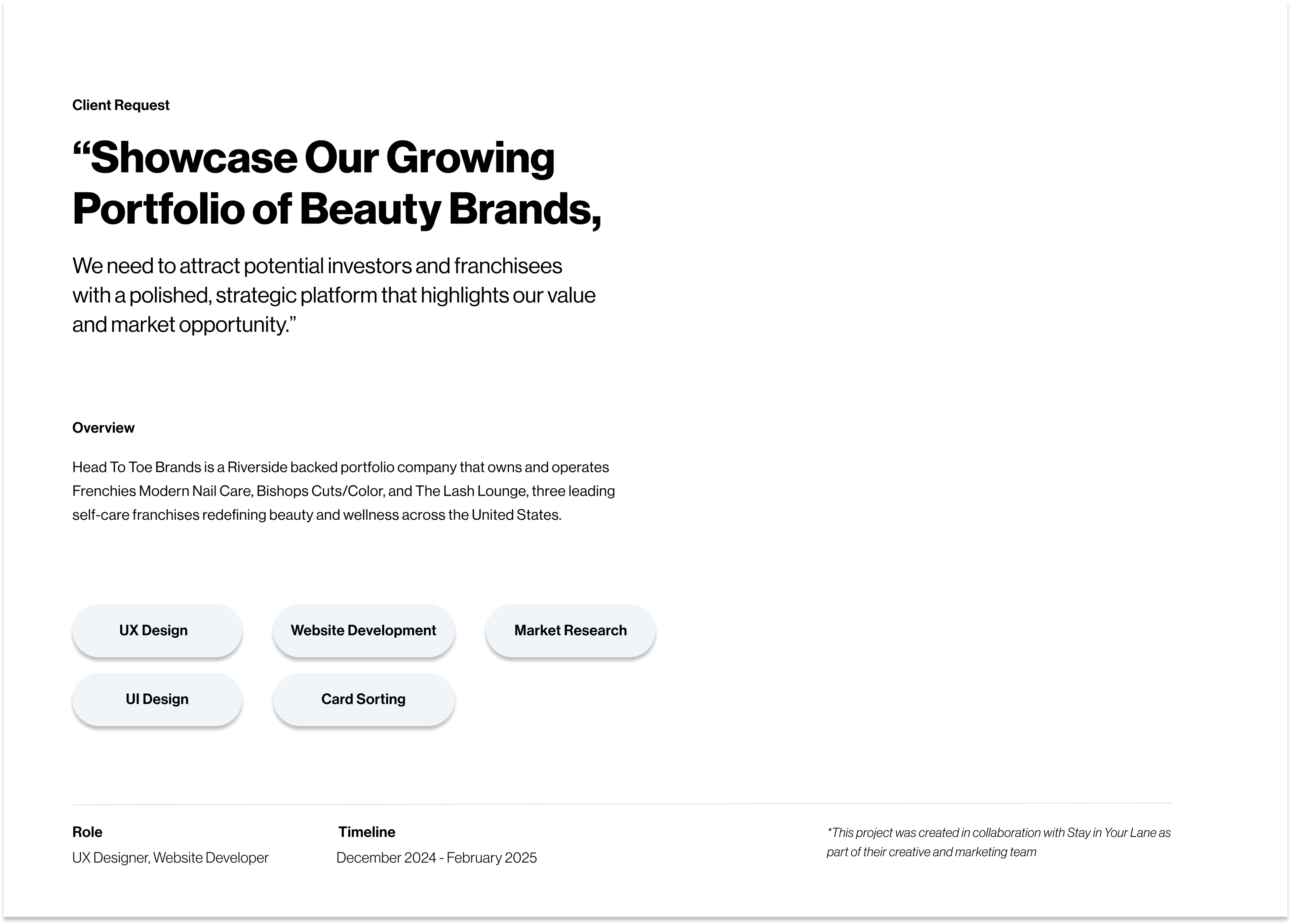 Head to Toe Brands manages a portfolio of beauty franchises, including Bishops Cuts/Color, Frenchies Modern Nail Care, and The Lash Lounge. The team at Stay In Your Lane Co. partnered with them to build a brand system and digital platform that showcases the strength of the portfolio, builds credibility with potential franchisees and investors, and reinforces the company’s backing by Riverside.