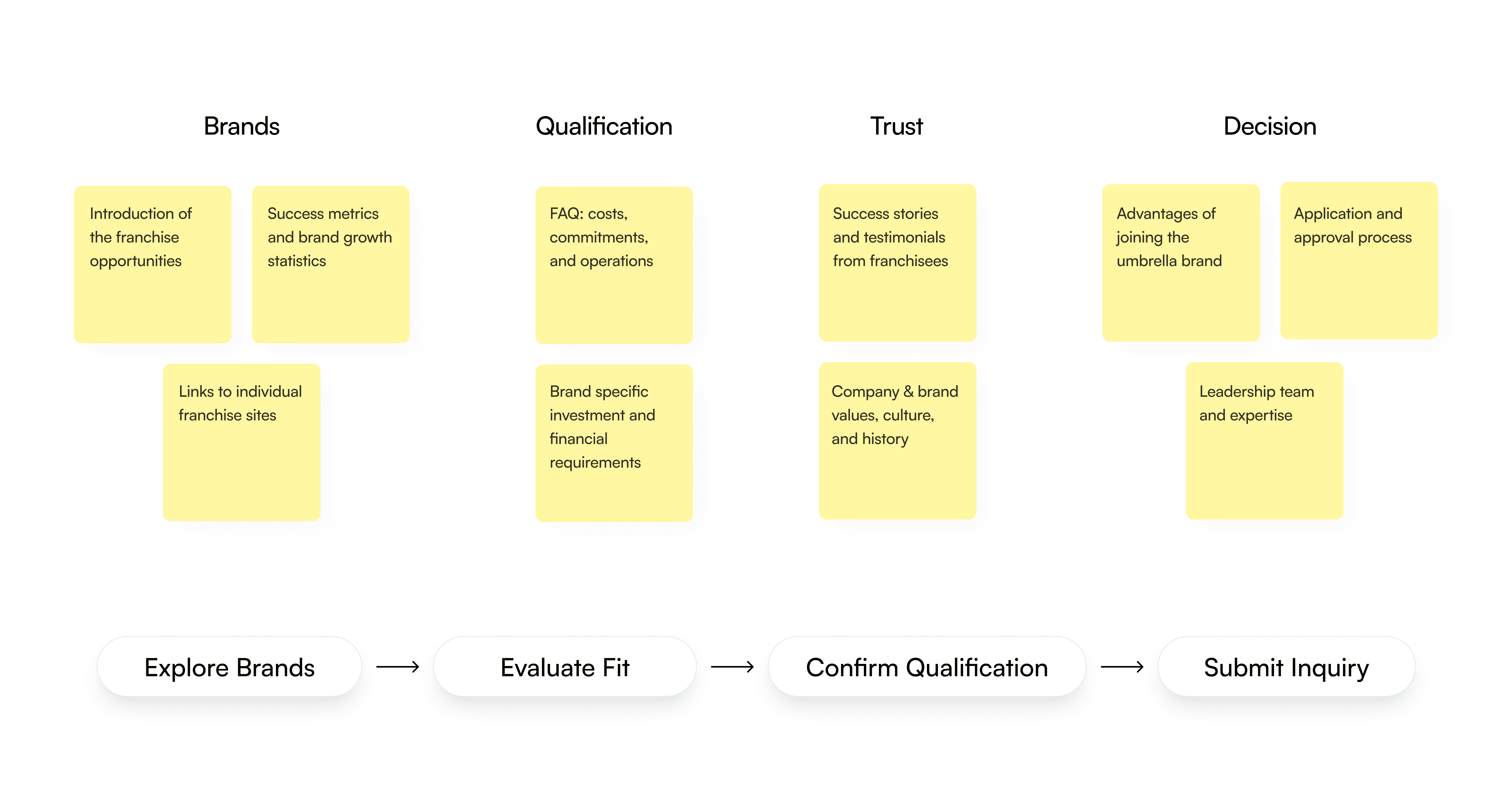 To guide direction, I used lightweight research methods including card sorting and informal interviews with three participants within our franchise prospect and investor profile. These insights helped identify what matters most when evaluating a franchise and were used to map the primary user flow.