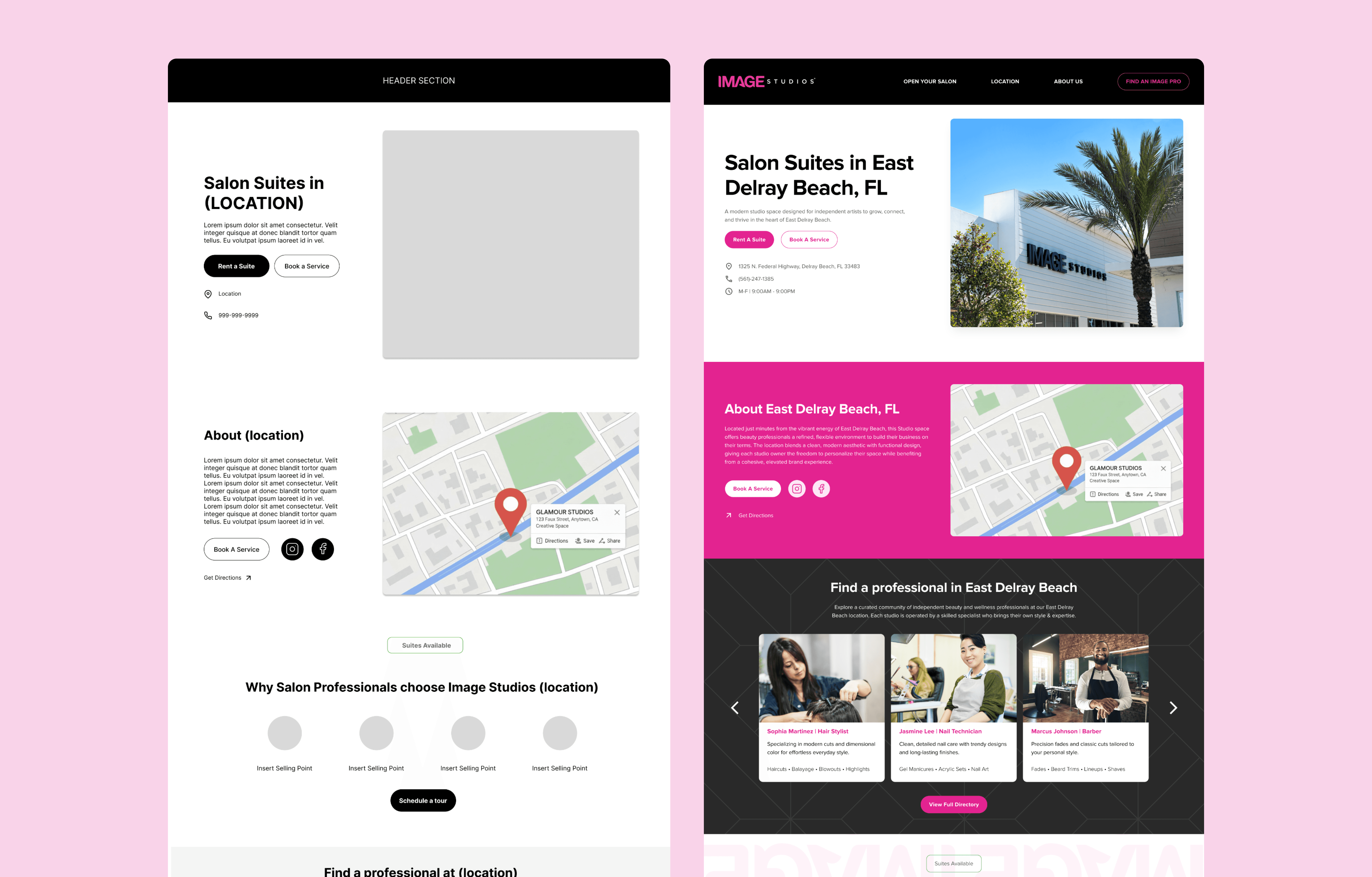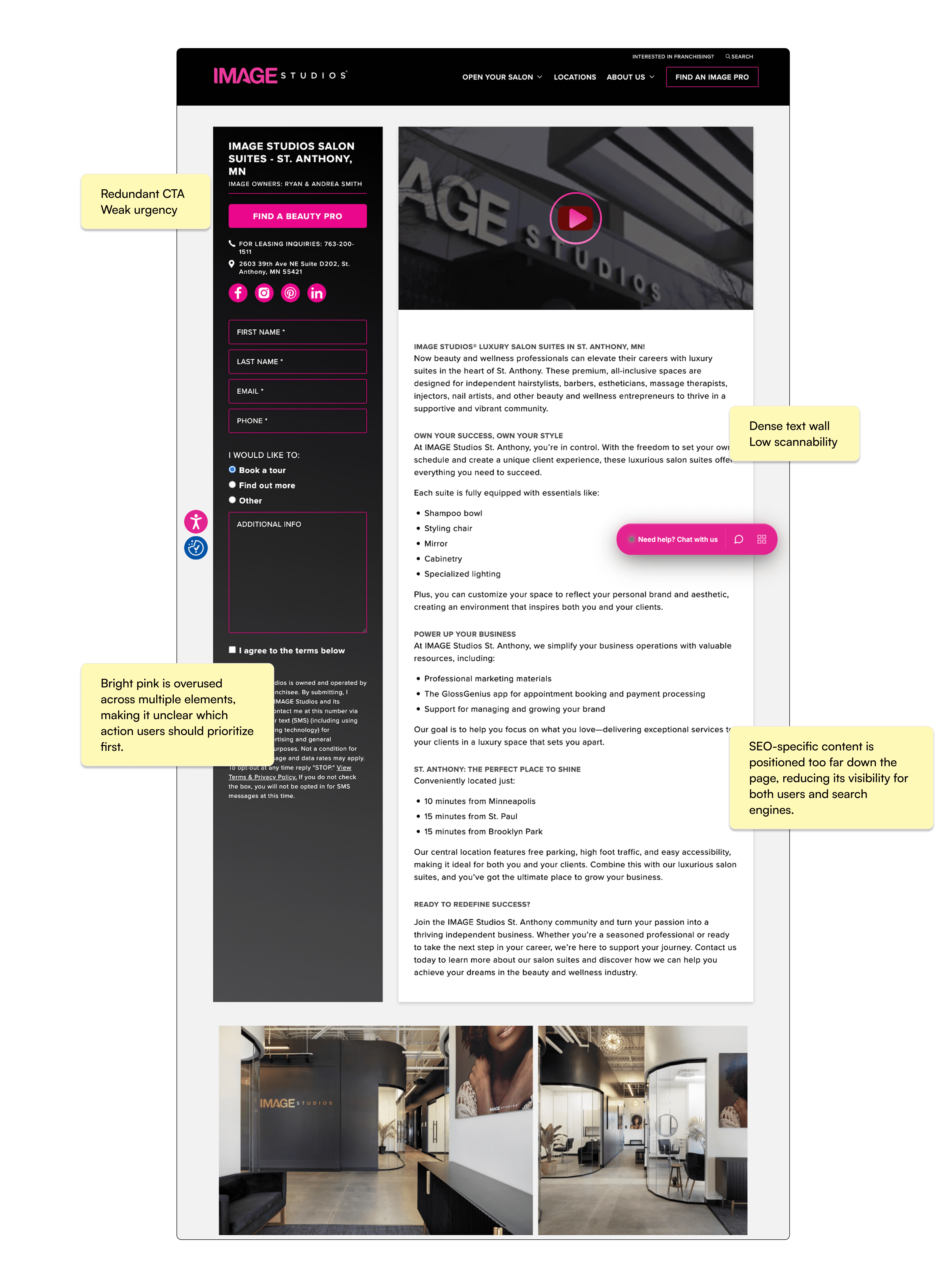This project focused on restructuring a single location page to better serve both prospective salon suite owners and clients booking services. The original experience lacked clarity, making it difficult to understand what actions to take.