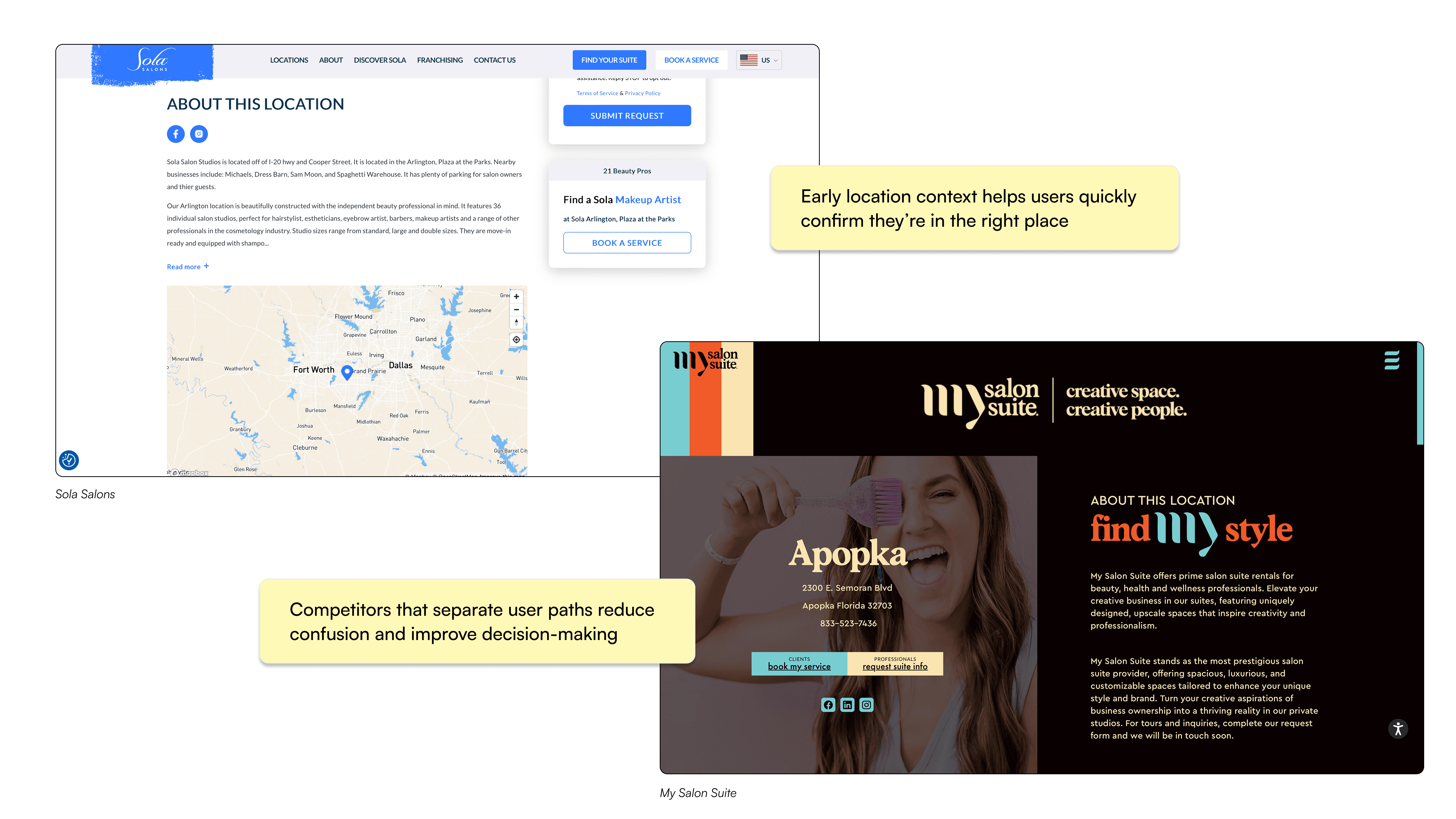 I conducted competitive research of salon suite and beauty booking experiences to understand how they structure content and guide different user types. I found that leading experiences introduced location context early and used two clear CTAs to separate user paths and clarify where to go next.