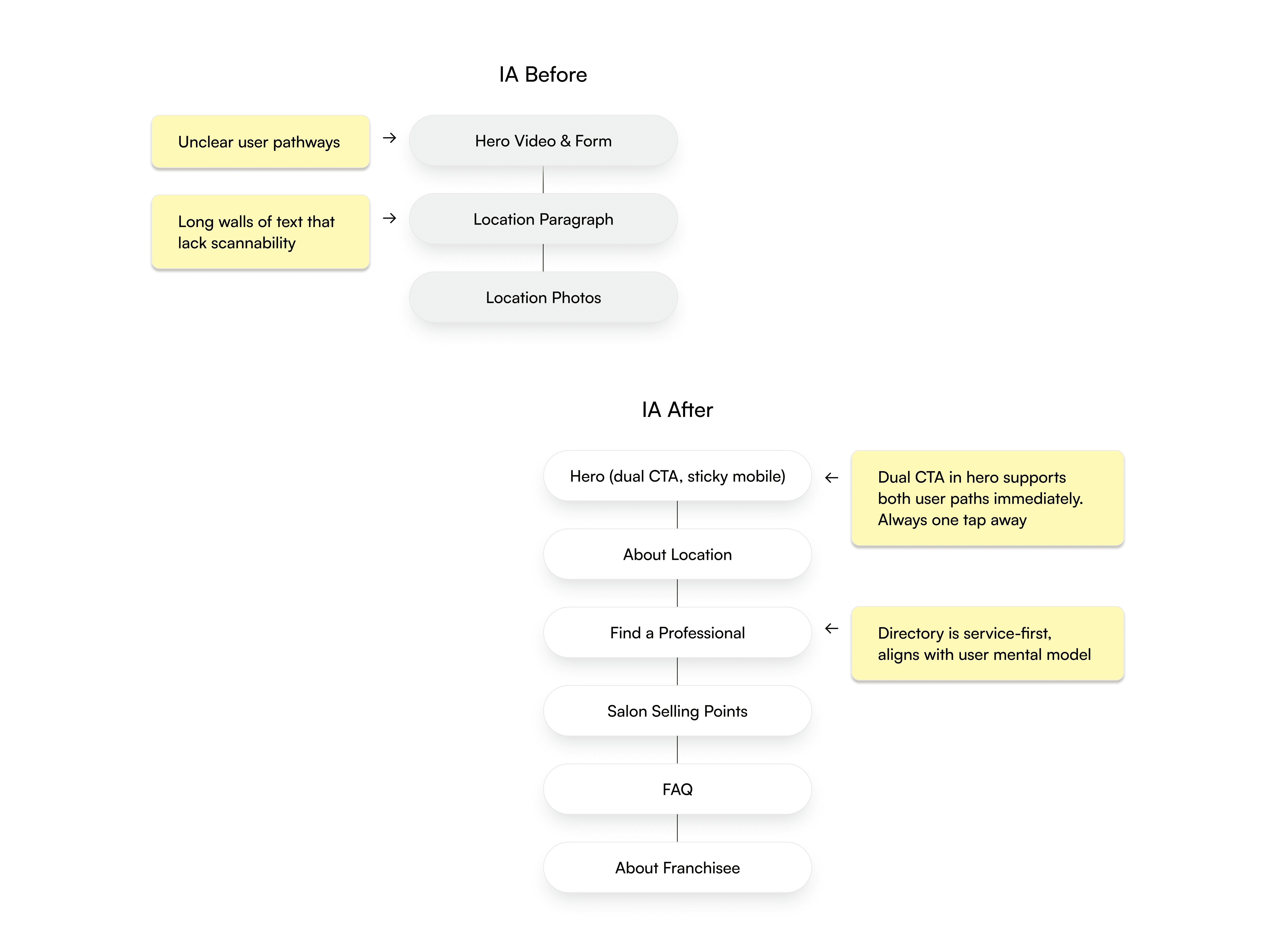 The updated IA introduces clear hierarchy, early context, and dual entry points for each user type.